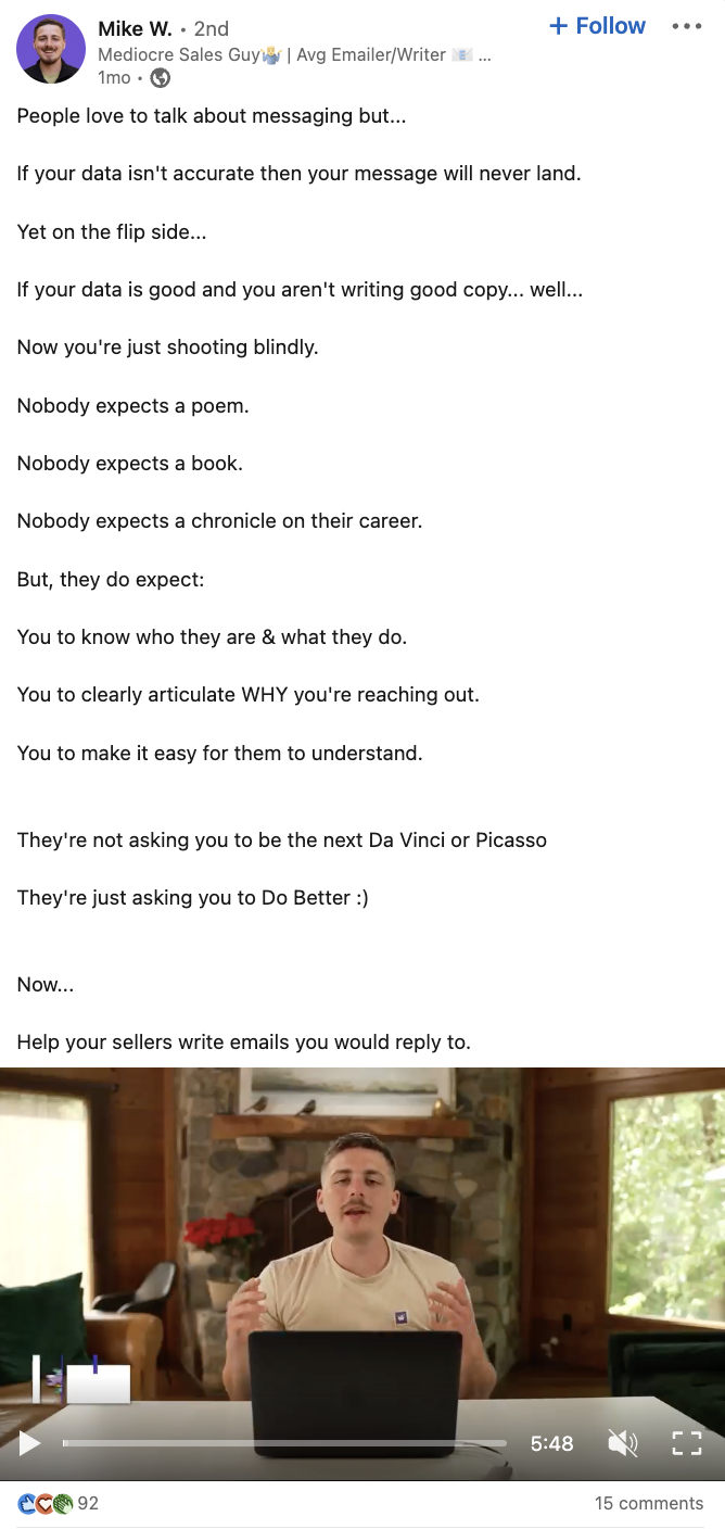 Mike Wander’s LinkedIn “3-Minute Sales School” update